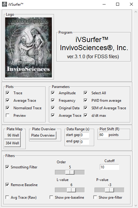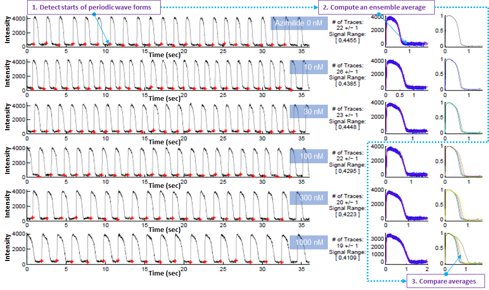 iVSurferTM is an automatic analyzer for periodic waveforms, including cardiac action potentials, calcium transients, and force of contraction. It is a powerful tool for high-throughput analysis of large data collected using multi-well plates (support up to 384-well format). Profiles of waves are analyzed individually and as their ensemble averages to calculate 24 available parameters. Displaying analysis of each well, users can monitor its progress in real time. Analysis parameters can be optimized to improve its performance.
